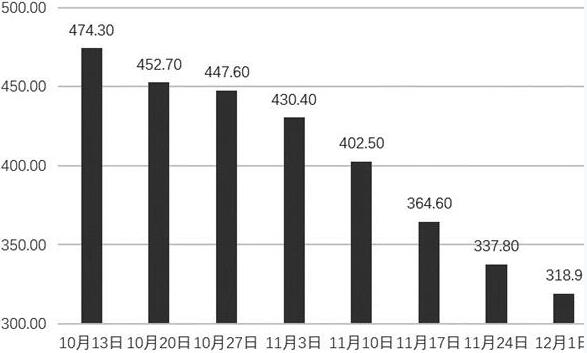 此外,限產(chǎn)存在地區(qū)的不均衡。冬季主要限產(chǎn)地區(qū)在螺紋鋼的主要產(chǎn)區(qū)——華北,但此時的北方正處于冬季,無論工地是否限停,基本都處于停工狀態(tài),因此限產(chǎn)對北方地區(qū)的需求影響不大。但在受限較少的南方,由于天氣溫暖,施工并未受到太大影響,需求減少不明顯。盡管如此,環(huán)保限產(chǎn)政策還是對需求有一定的抑制,鋼廠近期的產(chǎn)量數(shù)據(jù)還在下降,表明需求端并不樂觀。據(jù)中鋼協(xié)統(tǒng)計,10月全國重點鋼企粗鋼日均產(chǎn)量183.44萬噸,較上月下降1.9%。11月中旬重點鋼企粗鋼日均產(chǎn)量177.18萬噸,旬環(huán)比減少2.99萬噸,降幅1.66%。螺紋鋼現(xiàn)貨出貨節(jié)奏已經(jīng)開始減緩,從成交表現(xiàn)來看,終端采購積極性不高,市場出貨表現(xiàn)一般,這暗示著鋼廠的補庫差不多要完成。如果需求回落導致庫存下降趨勢扭轉,加上期現(xiàn)價格均突破年內(nèi)高位,市場心態(tài)可能出現(xiàn)轉變。
