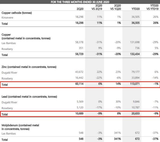 由于疫情的持續(xù)不確定性,MMG預(yù)計(jì)2020年Dugald River礦山鋅精礦產(chǎn)量為17-18萬噸,Rosebery礦山鋅精礦產(chǎn)量為5.5-6.5萬噸。