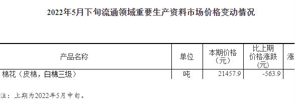 據(jù)對全國流通領(lǐng)域9大類50種重要生產(chǎn)資料市場價格的監(jiān)測顯示,2022年5月下旬與5月中旬相比,23種產(chǎn)品價格上漲,25種下降,2種持平,其中棉花下降2.6%。