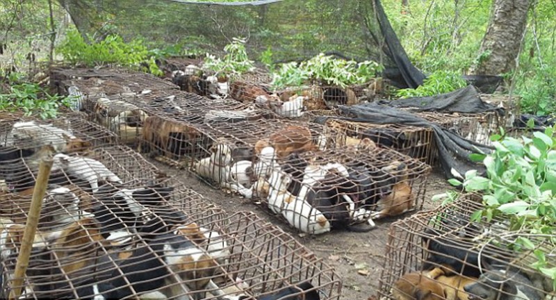 據(jù)英國(guó)《每日郵報(bào)》10月28日?qǐng)?bào)道,泰國(guó)北部ThaRae地區(qū)叢林中的狗屠宰場(chǎng)日前曝光,無(wú)數(shù)偷來(lái)的狗被關(guān)在狹窄的籠子里,然后通過(guò)邊境走私到老撾和越南,這些國(guó)家每年大約吃掉500萬(wàn)條狗。
