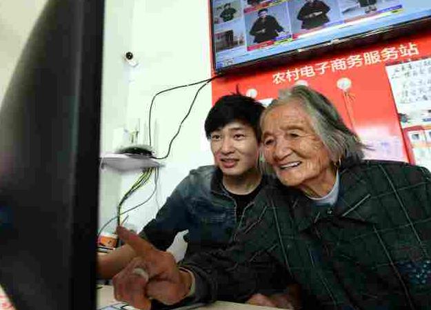 11月6日,浙江省湖州市長興縣洪橋鎮(zhèn)亭子橋村89歲的老人陳婉珍(右)在村淘合伙人陳濤(左)的幫助下網(wǎng)購衣服。