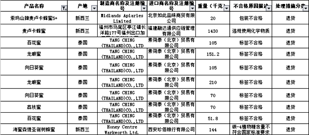 在不合格名單中,1批次新西蘭索瑪山牌麥盧卡蜂蜜5+因包裝不合格被退貨,進(jìn)口商為北京如此品味商貿(mào)有限公司;1批次新西蘭麥盧卡蜂蜜 因違規(guī)使用化學(xué)物質(zhì)被退貨,進(jìn)口商為福建融達(dá)通供應(yīng)鏈管理有限公司;7批次泰國百花蜜、龍眼蜜、荔枝蜜等產(chǎn)品因標(biāo)簽不合格被退貨,進(jìn)口商為素荷泰(北京)貿(mào)易有限公司;1批次新西蘭海蜜森緹圣誕樹蜂蜜因碳-4植物糖含量不符合國家標(biāo)準(zhǔn)而被退貨,進(jìn)口商為西安珍佰糧行有限公司。