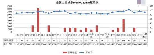 1月17日長材指數(shù)報137.2點,較上一交易日上漲0.42%。今日期螺1705全天沖高回落,現(xiàn)3284跌1.02%,縮量減倉。今日建材現(xiàn)貨市場價格震蕩走強。其中,濟南、合肥、北京、重慶等14個城市螺紋鋼價格上漲10-110元/噸,合肥市場螺紋鋼價格暴漲110元/噸,漲幅最大。據(jù)統(tǒng)計,全國25個主要市場HRB400(20mm)螺紋鋼價格報3393元/噸,較上一交易日價格上漲17元/噸。
