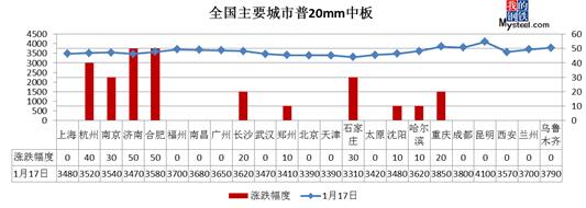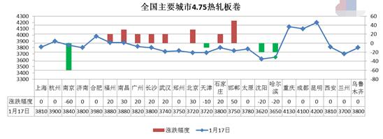 1月17日扁平材指數(shù)報121.84點,較上一交易日上漲0.12%。其中,熱軋板卷指數(shù)和中厚板指數(shù)分別上漲0.10%和上漲0.32%。今日熱卷期貨1705全天震蕩下跌,現(xiàn)3629跌1.63%,縮量減倉。4.75熱軋板卷市場價格盤整運行,福州、廣州、北京、石家莊等8個城市價格上漲20—50元/噸;南京、天津、沈陽市場價格下跌10—60元/噸。據(jù)統(tǒng)計,全國24個市場4.75mm熱軋板卷價格報3832元/噸,較上一交易日價格上漲4元/噸。