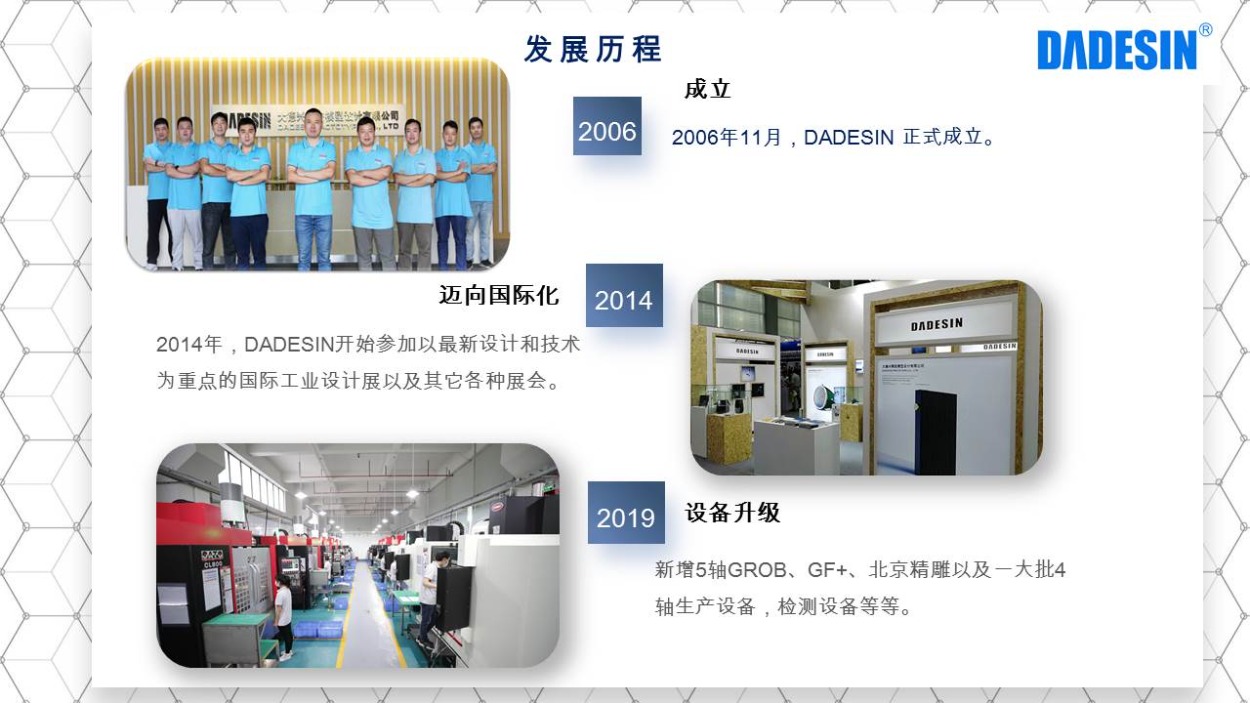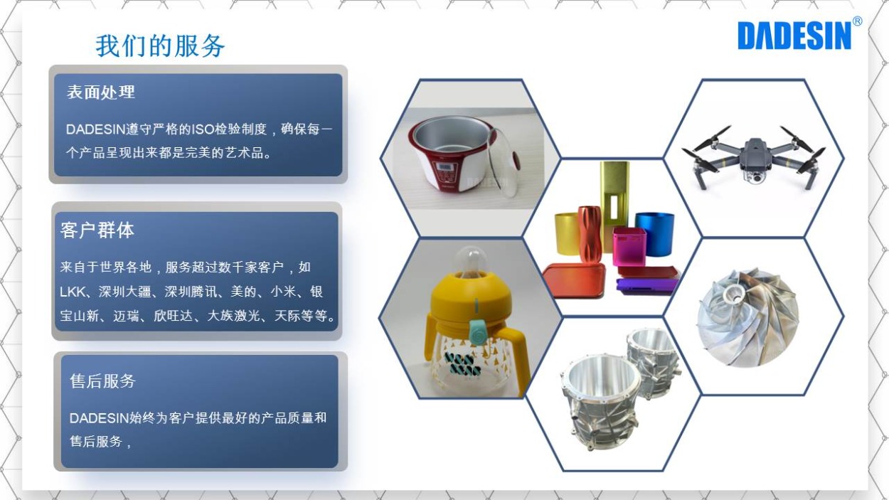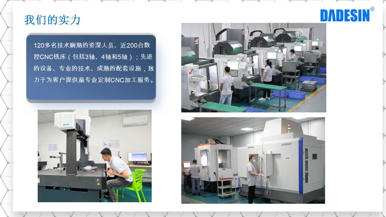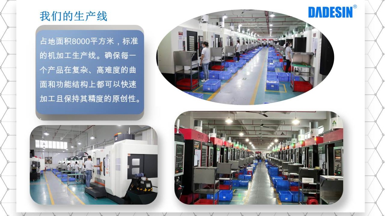 大德興精密創(chuàng)于2006年,是一家集加工設(shè)計(jì)、CNC生產(chǎn)制造、五金零件加工、噴涂噴漆、陽(yáng)極氧化、組裝和服務(wù)為一體的高精密生產(chǎn)制造廠家,公司占地總面積達(dá)8000平方米,現(xiàn)有員工100余人,其中專業(yè)技術(shù)人員80余人,設(shè)備配套齊全,所做產(chǎn)品從原材料到成品均可完成一站式生產(chǎn)。我們擁有德國(guó)格勞博(GROB)、瑞士米克朗(+GF)、國(guó)產(chǎn)北京精雕、美國(guó)哈斯(HAAS)