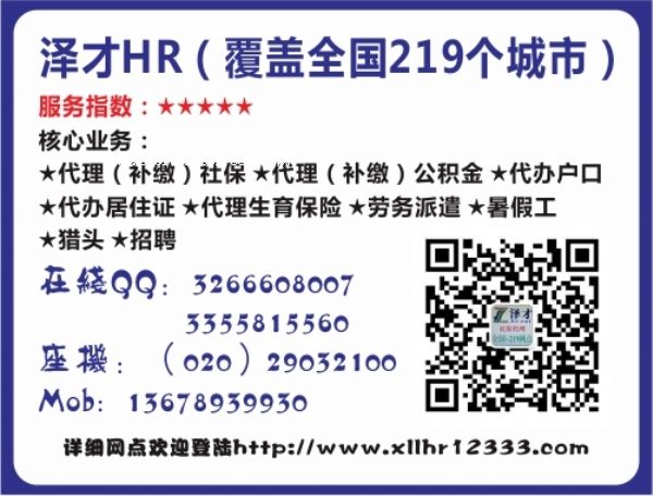 廣州澤才管理咨詢有限公司,注冊(cè)資金200萬,成立以來得到相關(guān)部門機(jī)構(gòu)和社會(huì)各界人士大力扶持,經(jīng)廣州市市工商注冊(cè)成立的正規(guī)合法社保公積金代理機(jī)構(gòu),擁有最新(買房、生育、讀書、入戶、申請(qǐng)其它)社保、公積金信息政策優(yōu)勢(shì),是一家專業(yè)從事社保代理(補(bǔ)繳)、生育保險(xiǎn)報(bào)銷、住房公積金代繳(補(bǔ)交)、居住證、入戶的企業(yè)管理機(jī)構(gòu)。
