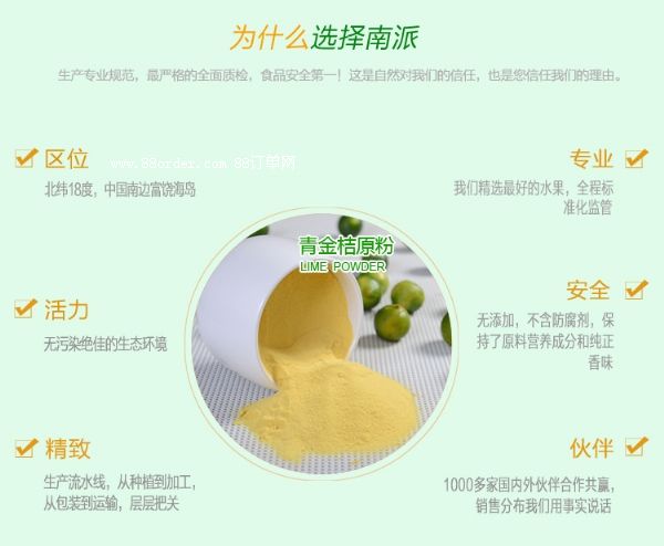 南派青金桔原粉選用海南島獨(dú)特的青金桔鮮果肉榨漿,經(jīng)世界先進(jìn)的噴霧干燥工藝技術(shù)加工制成,有效保持了新鮮青金桔的營養(yǎng)成份和香味,即時溶解,使用方便。