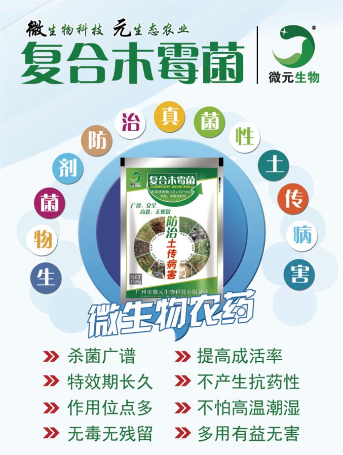 廣州市微元生物科技有限公司復(fù)合木霉菌新型微生物農(nóng)藥,通過產(chǎn)生抗生素、營養(yǎng)競爭、微寄生、細(xì)胞壁分解酵素、以及誘導(dǎo)植物產(chǎn)生抗性等機(jī)制,對于多種植物病原菌具有拮抗作用,復(fù)合木霉菌具有保護(hù)和治療雙重功效,可有效防治土傳性真菌病害,在苗床使用木霉菌劑,可提高育苗與移植的成活率,保持秧苗健壯生長。特效期長,作用位點多,不產(chǎn)生抗藥性,突破常規(guī)殺菌劑受限條件,不怕高濕,而且濕度越大防治效果越好。殺菌譜廣,無殘留毒性,對作物沒有任何不良影響。