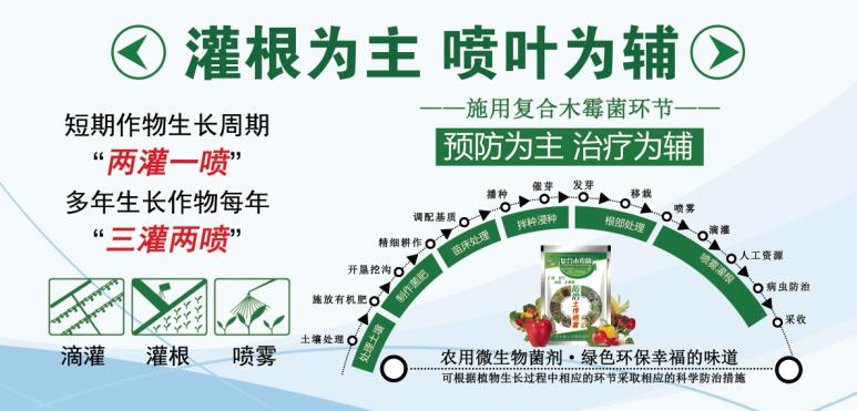 復(fù)合木霉菌依不同作物種類與作物不同時期有不同的使用方式,主要是要讓復(fù)合木霉菌均勻分布于植物根部、表面與土壤中,短期作物預(yù)防使用3次以上,果樹花卉等多年生作物每年使用5次以上,復(fù)合木霉菌使用次數(shù)越多效果越明顯,長期使用可有效減少土壤傳播病害發(fā)生,多用有益無害。復(fù)合木霉菌一藥多用,降低防治成本,寄生的同時可產(chǎn)生各種抗生素和溶解酶,降低病原的抗藥性,加強(qiáng)抑菌強(qiáng)度;復(fù)合木霉菌的幾丁質(zhì)酶基因可在細(xì)菌、真菌和植物中表達(dá),對于防止植物真菌病害、促進(jìn)農(nóng)作物生長。