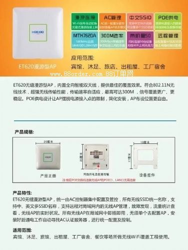 東莞市杰迪電子科技有限公司生產(chǎn)研發(fā)的et943無縫漫游型無線ap是一款高性能無線ap,適合任何場所做無線覆蓋上網(wǎng)。該設(shè)備射頻輸出最大輸出500mw,最高傳輸速率可達(dá)300m。具有性能穩(wěn)定、輸出信號強(qiáng),靈敏度高等特點(diǎn)。無線ap產(chǎn)品廣泛適用于酒店、賓館、ktv、車間、咖啡餐廳等需要wifi無線上網(wǎng)的場所,應(yīng)用范圍廣,針對客戶不同需求進(jìn)行無線覆蓋,讓用戶可以隨時(shí)隨地、無拘束的連接到wifi無線網(wǎng)絡(luò),給工作和生活帶來巨大的便利。