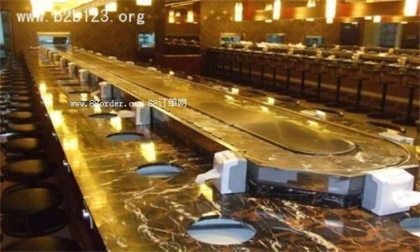 鏈板及鏈條均采用304磨沙面沖壓而成,板厚1.8mm,寬度140mm,鏈條節(jié)距100mm,鏈條下部分導(dǎo)軌面板采用304銹鋼鏡面,板厚度為1.2mm,內(nèi)部采用白色防摩尼龍墊條,旋轉(zhuǎn)吧臺,壽司料理,旋轉(zhuǎn)火鍋,自助火鍋餐廳。