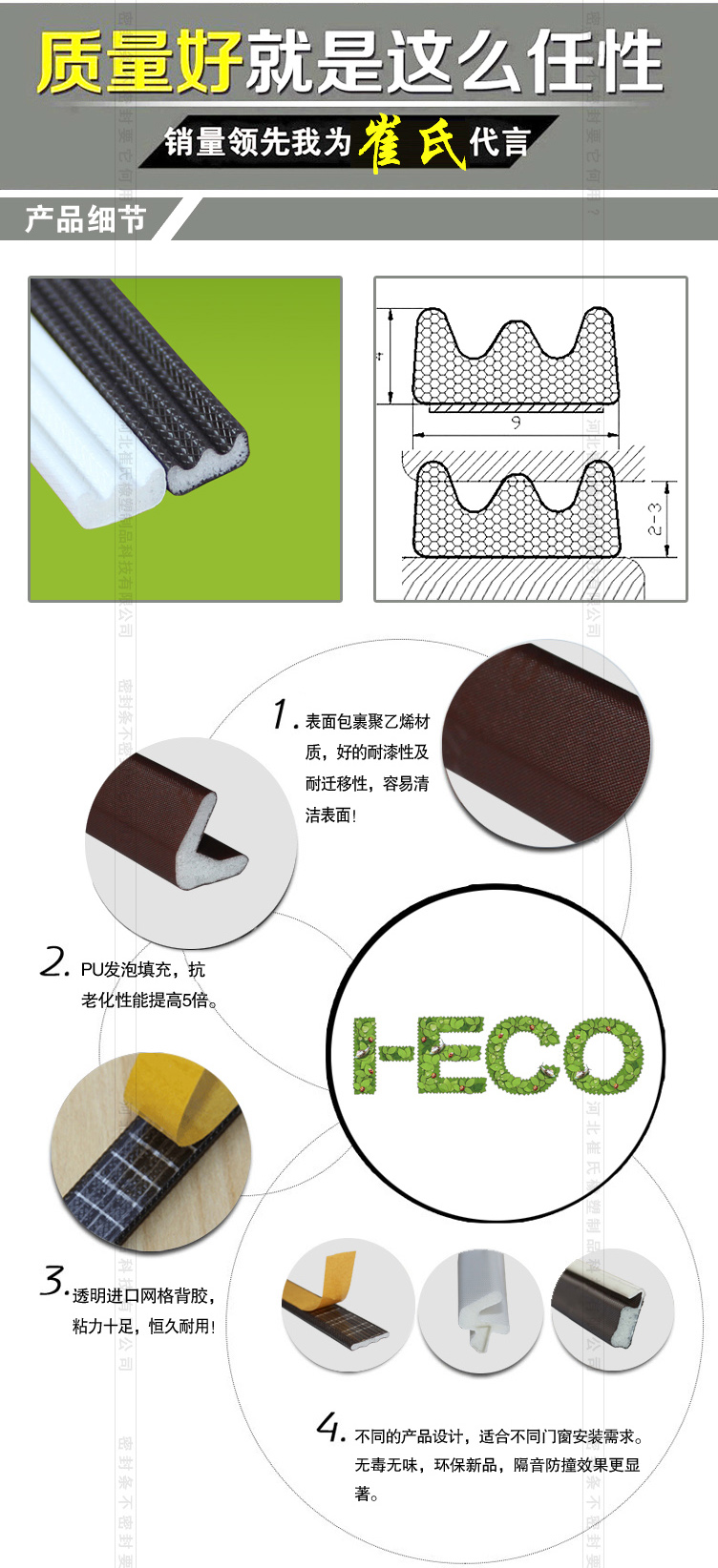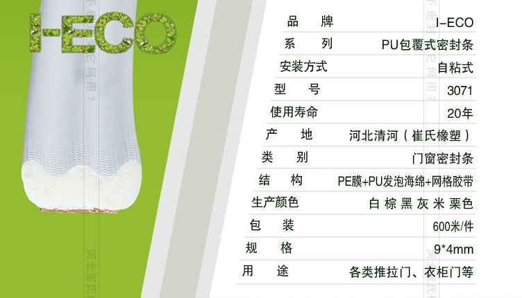 包覆式密封條在耐老化、耐疲勞、壓縮變形測試、壓縮力測試、熱傳導(dǎo)k值測試、水侵性、水滲透性等測試中均取得超越所有傳統(tǒng)產(chǎn)品的優(yōu)秀的結(jié)果;同時包覆式密封條節(jié)能環(huán)保、隔音降噪、抗強紫外線,無毒、不與任何油漆、清潔劑發(fā)生反應(yīng),迎合新時代綠色健康主題。