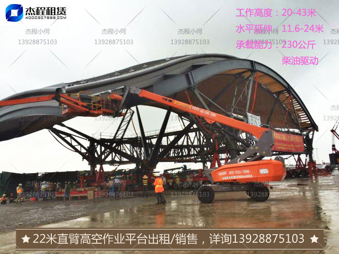 2、24米直臂高空車:平臺(tái)高度22.15米,工作高度24.15米,水平延伸16.23米,承載230公斤;