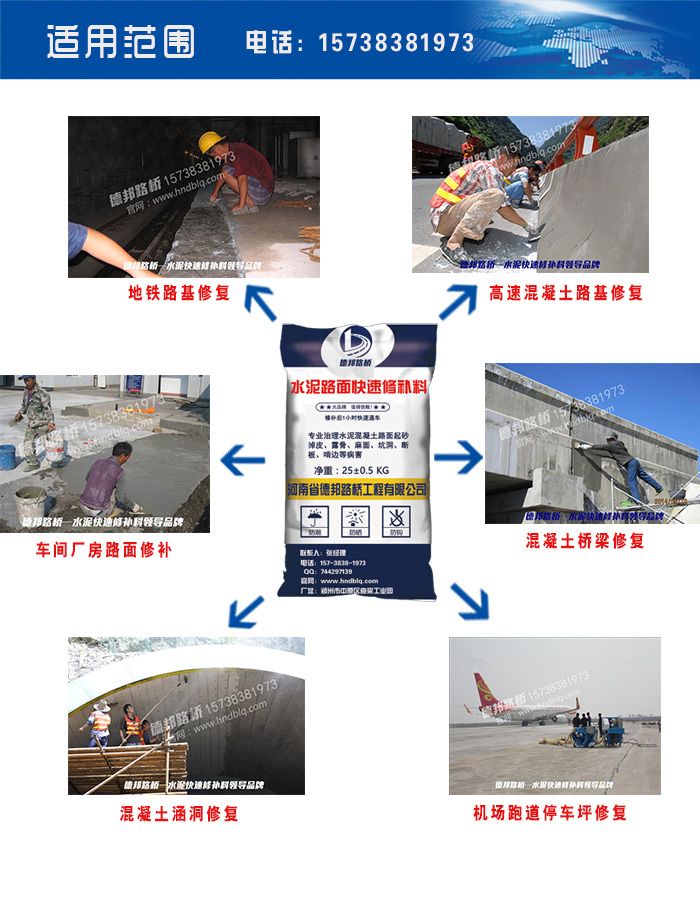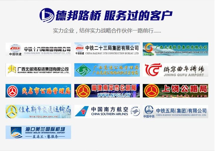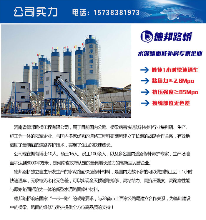 德邦路橋工程(河南)有限公司是國內(nèi)唯一能夠系統(tǒng)解決水泥混凝土路面表層、深層各種結(jié)構(gòu)類病害的專業(yè)公司。我們的修補材料對于橋梁伸縮縫、橋梁鋪裝層的修復,能夠做到1小時恢復通車!為二十余省的高速、國道、省道、縣鄉(xiāng)道路、市政工程改造及養(yǎng)護提供了系統(tǒng)的解決方案和優(yōu)質(zhì)的產(chǎn)品服務。2016年德邦路橋成為多省“國家道路迎國檢指定品牌”,確立了行業(yè)龍頭地位!