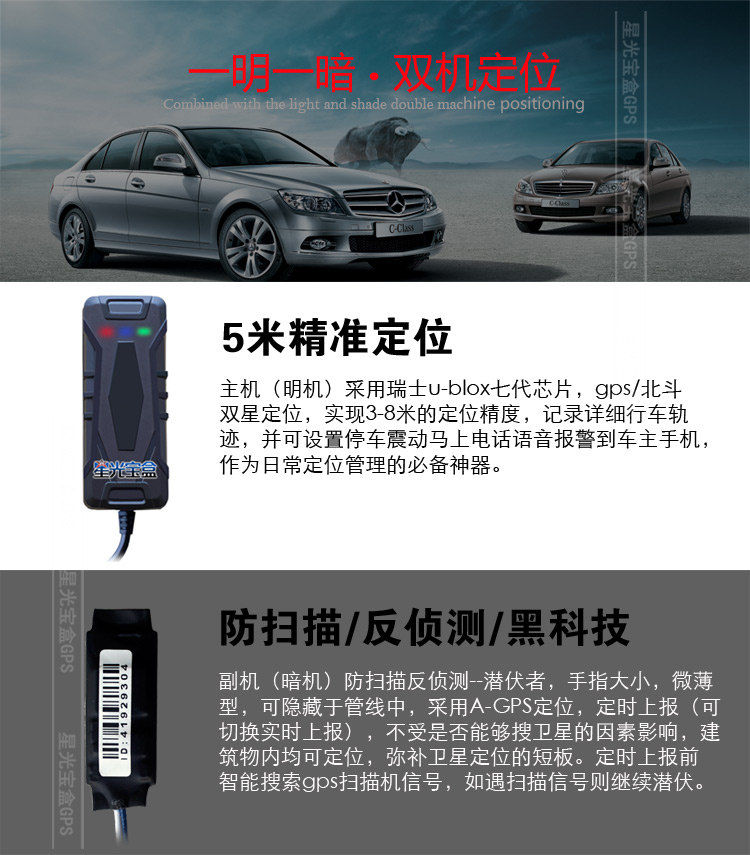 星光寶盒g(shù)ps定位器均采用瑞士ublox 第7代 g7020 芯片并且采用工業(yè)級(jí)模塊,適應(yīng)車(chē)輛使用環(huán)境,耐溫抗寒,抗震,產(chǎn)品定位精準(zhǔn),品質(zhì)穩(wěn)定,經(jīng)久耐用,能夠出色的完成對(duì)汽車(chē)或摩托車(chē)進(jìn)行位置追蹤與監(jiān)控。為汽車(chē)和摩托車(chē)用戶提供可靠的防盜監(jiān)控使用功能,以及車(chē)隊(duì)用戶更有效的管理監(jiān)控車(chē)輛。