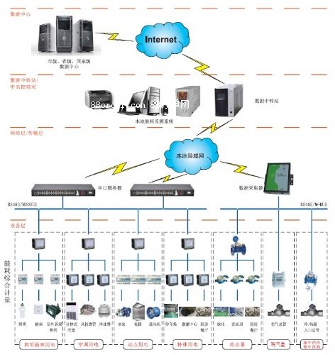 能耗監(jiān)測系統(tǒng)是用于樓宇建筑的所有能耗的監(jiān)測數(shù)據(jù)的管理。系統(tǒng)由能源綜合管理平臺(tái)軟件系統(tǒng)、中間通訊管理系統(tǒng)設(shè)備、數(shù)據(jù)計(jì)量采集、終端設(shè)備組成,分為三層網(wǎng)絡(luò)結(jié)構(gòu),采用瀏覽器/服務(wù)器(b/s)與客戶機(jī)/服務(wù)器(c/s)相結(jié)合的組網(wǎng)方案,利用單位局域網(wǎng)的預(yù)留虛擬id,完成整個(gè)系統(tǒng)的網(wǎng)絡(luò)搭建,借助網(wǎng)絡(luò)實(shí)現(xiàn)數(shù)據(jù)的上傳、命令的下發(fā)。