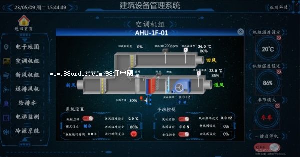 ●手動/遠程-自動控制;連鎖控制;風機狀態(tài)顯示;風管溫濕度測量;水閥調(diào)節(jié);風門控制;過濾器狀態(tài)顯示;co2監(jiān)測;加濕控制;冷凝管防凍控制;變頻器控制;外部信號聯(lián)動。
