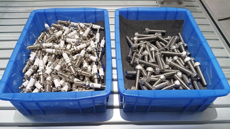 火花塞和螺釘無序的擺放在料框里,通過人工包裝挑選,根據(jù)工件正反面確認是否需要翻轉,完全靠人工,工人勞動強度大,成本高,因此需要進行自動化改造。