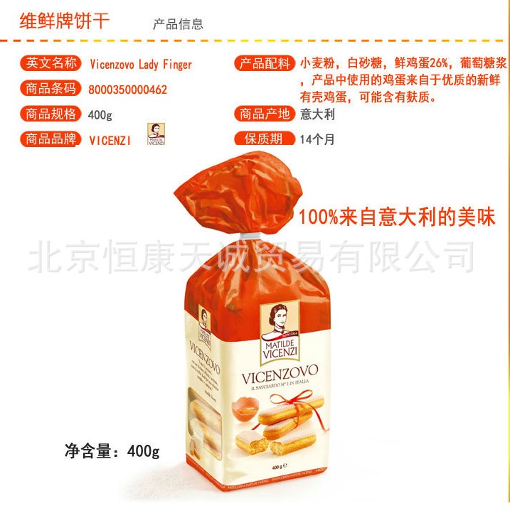 意大利百年品牌 — —vicenzi(維鮮)研制出品,誘人的外表,營養(yǎng)的內(nèi)在,不含反式脂肪,不含氫化脂肪,尊貴的品質(zhì),精益求精,香酥、濃郁、松化,無論是做為早餐,還是下午茶,或是外出工作,隨身備上一包,都是非常不錯的選擇。