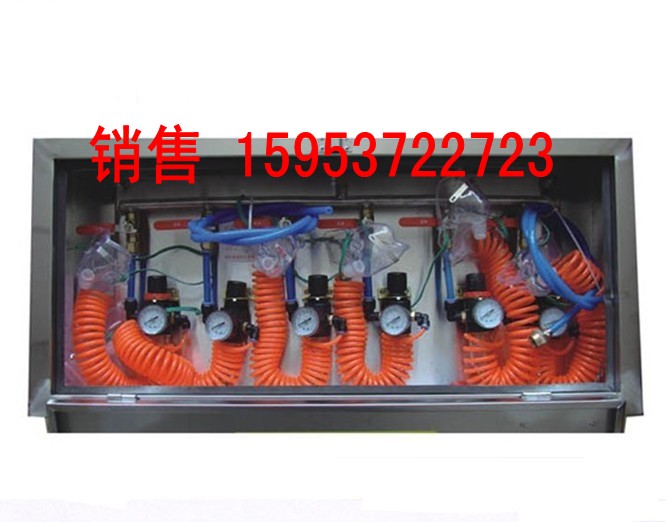 壓風(fēng)自救裝置包括箱體,箱體上設(shè)有壓風(fēng)接頭,其內(nèi)設(shè)有多組分別與壓風(fēng)管相連的呼吸器,每組呼吸器的支管上均設(shè)有手動(dòng)進(jìn)氣閥。當(dāng)作業(yè)場(chǎng)所發(fā)生有害氣體突然涌出、冒頂和坍塌等危險(xiǎn)情況時(shí),現(xiàn)場(chǎng)人員來(lái)不及撤離,可就近利用壓風(fēng)自救裝置實(shí)行自救。打開(kāi)門(mén)蓋,取出呼吸面罩帶上,鈕開(kāi)進(jìn)氣閥,通過(guò)供氣量調(diào)節(jié)裝置對(duì)壓風(fēng)管路提供的壓風(fēng)根據(jù)需要進(jìn)行調(diào)節(jié),再通過(guò)氣動(dòng)減壓閥,進(jìn)行減壓和消除噪聲,然后由積水杯將不清潔的壓風(fēng)變成清潔的呼吸空氣,供給現(xiàn)場(chǎng)人員呼吸,達(dá)到穩(wěn)定情緒、實(shí)現(xiàn)現(xiàn)場(chǎng)自救目的。