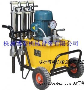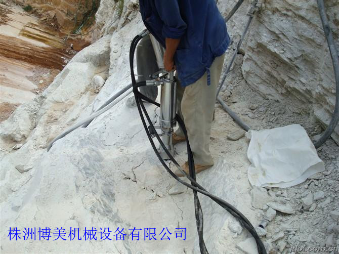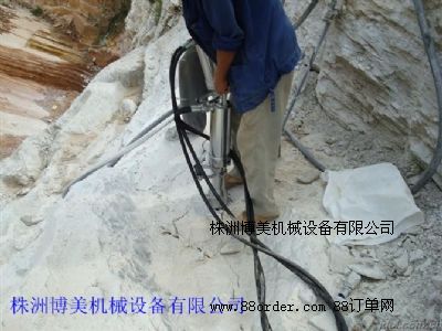 花崗石礦山的開采:花崗石礦山機械化開采難度相對較大。近幾年主要以株洲市博美機械有限公司生產的液壓分裂機開采為主,進行花崗石的開采,此種設備主要由泵站和分裂器兩大部分組成,由泵站輸出的高壓油,驅動油缸,產生巨大推力,驅動楔塊組中的中間楔塊向前駛出,將反向楔塊向兩邊撐開。