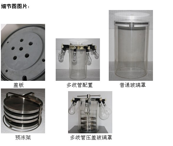 zx-lgj-1c壓蓋型 冷凝溫度(空載)-50℃、真空度(空載)13pa以下、空載凍干面積0.08㎡干燥盤三層,可放置物料約900ml(料厚10mm)、凍干時(shí)間 物料厚度不超過10mm時(shí),冷干時(shí)間一般24小時(shí)左右、干燥室尺寸 φ320×550(mm)、標(biāo)準(zhǔn)配置 臺(tái)式主機(jī),8接口多歧管壓蓋干燥裝置,8個(gè)凍干瓶(500ml、250ml、100ml、50ml各2只)2升國(guó)產(chǎn)真空泵和連接件,預(yù)凍架和保溫蓋板、主機(jī)尺寸 550×550×300(mm)