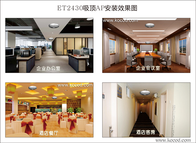 et2430大功率吸頂式無(wú)線ap,性能穩(wěn)定,信號(hào)覆蓋范圍廣,樓層設(shè)備少,能有效避免同頻干擾。施工簡(jiǎn)單快捷,美觀大方,對(duì)新裝酒店與改造酒店都很方便,不需要對(duì)客房原有線路做任何改變。超強(qiáng)性能,造價(jià)成本低,是目前酒店常用的無(wú)線覆蓋方案。