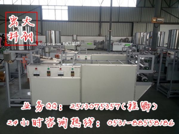 宏大科創(chuàng)豆腐皮機器采用全自動、全封閉、蒸汽供熱一條龍生產(chǎn),其制成品具有外觀平整、色澤淡黃、鮮艷晶亮、保質(zhì)期長、口感軟筋、易運輸?shù)忍攸c。經(jīng)過多年研究,制造出豆腐皮機組,使豆腐皮生產(chǎn)進入工業(yè)化階段。我們的自動豆腐皮機生產(chǎn)效率高、成本低、寬窄自調(diào)、省時省力;所產(chǎn)產(chǎn)品色澤鮮亮、口感良好、市場口碑好。自動豆腐皮機(百葉機、豆腐皮機、豆腐皮機)生產(chǎn)出來的各種產(chǎn)品,采用獨特配方可生產(chǎn)五香味、魚味、雞味、麻辣味、孜然味、三鮮味等多種風(fēng)味的豆腐絲、豆腐卷、豆腐干等的風(fēng)味食品。該機結(jié)構(gòu)緊湊、性能穩(wěn)定、工藝先進、操作方便。是實現(xiàn)大豆深加工轉(zhuǎn)化為經(jīng)濟優(yōu)勢的理想機之一。如果您有什么想要詳細咨詢了解的可以加我們的在線客服qq:2513075357或者打我們下方的咨詢電話:0531-88558186或13075303743與我們聯(lián)系。歡迎廣大客戶來宏大科創(chuàng)參觀學(xué)習(xí)!
