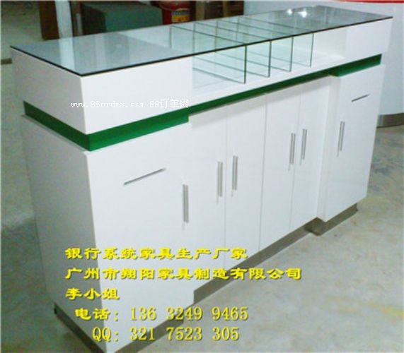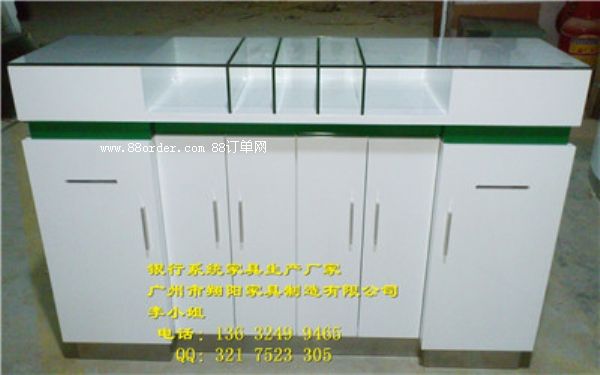 材質(zhì):8mm鋼化玻璃臺(tái)面,白色烤漆臺(tái)身,信合藍(lán)裝飾邊,白色烤漆免漆板內(nèi)柜,拉絲不銹鋼底座,可按要求定做。