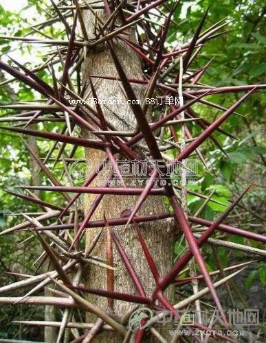 【藥材性狀】藥材商品包括主刺及1~2次分枝的棘刺。主刺長(zhǎng)3~15厘米或更長(zhǎng),直徑0.3~1厘米;分枝刺長(zhǎng)1~6厘米,刺端銳尖。表面紫棕色或棕褐色。體輕,質(zhì)堅(jiān)硬,不易折斷。切片厚0.1~0.3厘米,常帶有尖細(xì)的刺端;木部黃白色,髓部疏松,淡紅棕色;質(zhì)脆,易折斷。無(wú)臭,味淡。