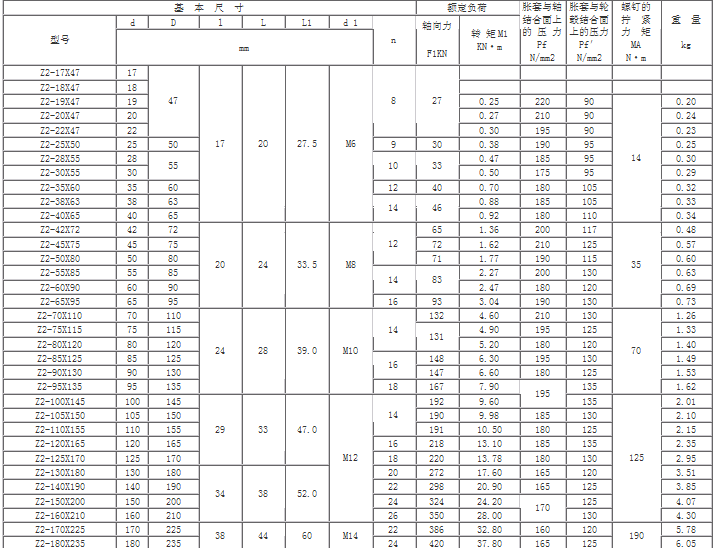 本廠z2型脹緊套的尺寸與參數(shù)(jb/t7934-1999)