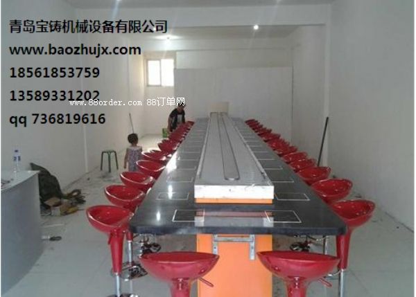 2、節(jié)省人力物力:客人在各自的座位上可隨意選擇擺放在輸送帶上的食品,無需服務(wù)員送上,而且設(shè)備有餐臺(tái),可節(jié)省大量餐桌及臺(tái)布。事實(shí)證明,該設(shè)備是投資少,運(yùn)行費(fèi)用最低、回報(bào)率最高的餐飲設(shè)備。