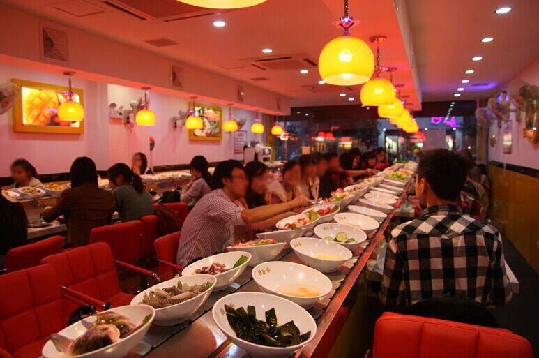 回轉(zhuǎn)壽司設(shè)備 回轉(zhuǎn)火鍋設(shè)備是我公司自創(chuàng)開發(fā)的一種新型菜料自動輸送設(shè)備,輸送長度可根據(jù)客戶的場地造型尺寸定做,輸送鏈板采用304不銹鋼制造,具有美觀、清潔、衛(wèi)生,輸送方向,速度任意可調(diào),是各種自助火鍋,自助早餐的新型時尚的設(shè)備。傳動部分采用臺灣產(chǎn)(城邦牌)2hp-1500w變頻減速電機,速比1:100,變頻器采用220v,2hp-1500w.se系列,線速2-8米/分鐘 可調(diào)。壽司線,回轉(zhuǎn)壽司線,回轉(zhuǎn)火鍋線專為大中小型餐飲連鎖企業(yè)量身定做,適應(yīng)了飲食界推陳出新,適應(yīng)了現(xiàn)代人對飲食新奇的追求,必會掀起都市飲食新潮。