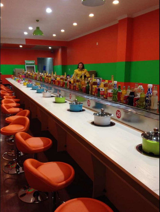 旋轉(zhuǎn)吧臺(tái),壽司料理,旋轉(zhuǎn)火鍋,自助火鍋餐廳。下架采30mm*30mm*1.5的碳鋼方管焊接而成,表面經(jīng)過(guò)防銹處理,所有連接部分均采用標(biāo)準(zhǔn)件連接,便于移裝。