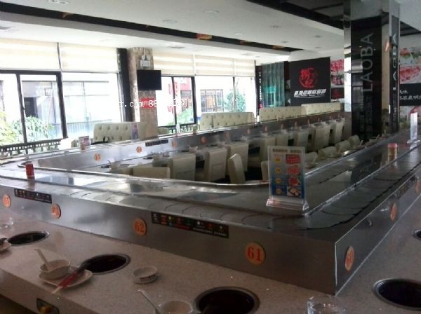 旋轉(zhuǎn)吧臺(tái),壽司料理,旋轉(zhuǎn)火鍋,自助火鍋餐廳。下架采30mm*30mm*1.5的碳鋼方管焊接而成,表面經(jīng)過防銹處理,所有連接部分均采用標(biāo)準(zhǔn)件連接,便于移裝。