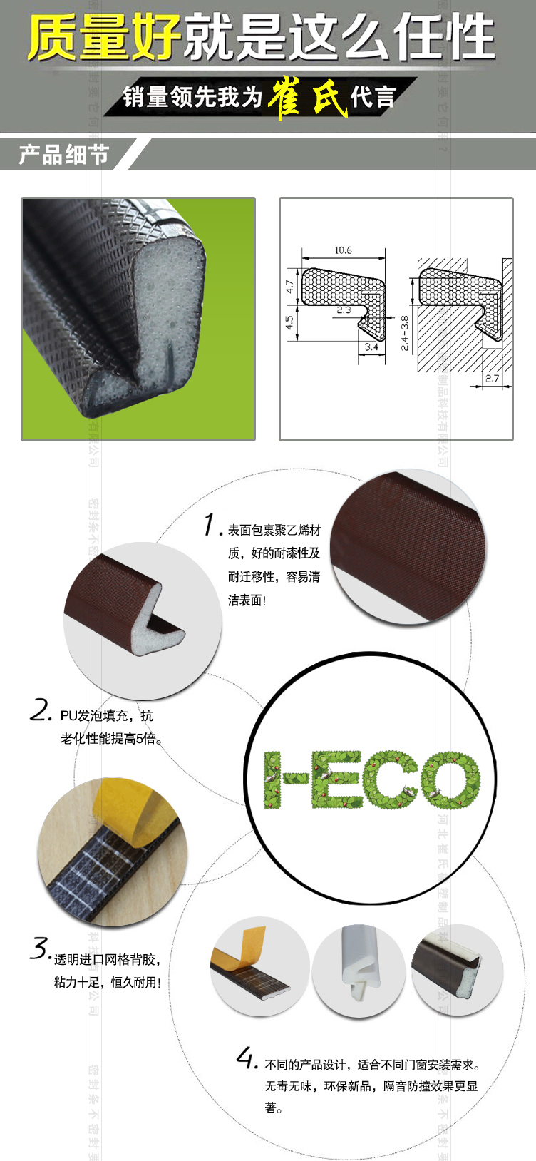 1:功能持久裝配效率提高50% 自粘式及快速插入式設(shè)計(jì),僅在拐角處剪切即可能夠迅速而簡單的安裝優(yōu)越的彈性使窗戶的誤差降至最低,在寒冷的條件下仍然保持極佳的彈性,隔音降噪干性操作、無膠涂層。