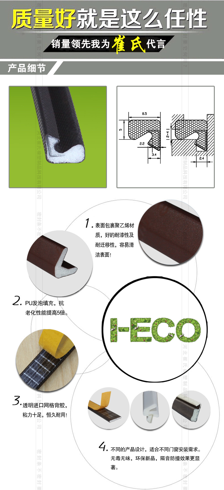 隔熱防寒,防風(fēng)塵及爬蟲(chóng),外觀高檔,耐老化 防紫外線 防水不變形 產(chǎn)品質(zhì)保10年 深得國(guó)內(nèi)高端門(mén)窗廠家認(rèn)可,是目前國(guó)內(nèi)最高端的新一代門(mén)窗密封條產(chǎn)品