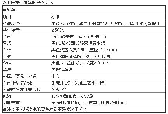 585*16k(雙股) 黑色烤漆8面16股雙槽骨傘架;黑色烤漆鐵質(zhì)傘架,直徑≥13.3mm;黑色橡膠漆拇指手柄;黑色長柄塑料頭,長度≥70mm,黑鎳鐵傘珠。傘面4片銀色logo,布套上印刷企業(yè)logo。