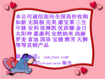 歡迎致電咨詢收購熱線159-7544-1139或qq:179-000-1612陳生。陳生長期收購安然納米貨款,高價收購寶健產(chǎn)品。本人還長期收購權(quán)健、康寶萊、無限極、玫琳凱、如新、完美、三生、雅芳、富迪、太陽神、優(yōu)莎娜、羅麥、天獅、國珍、嘉康利、尚赫,安然納米等產(chǎn)品。需要處理以上產(chǎn)品的朋友,歡迎致電咨詢。
